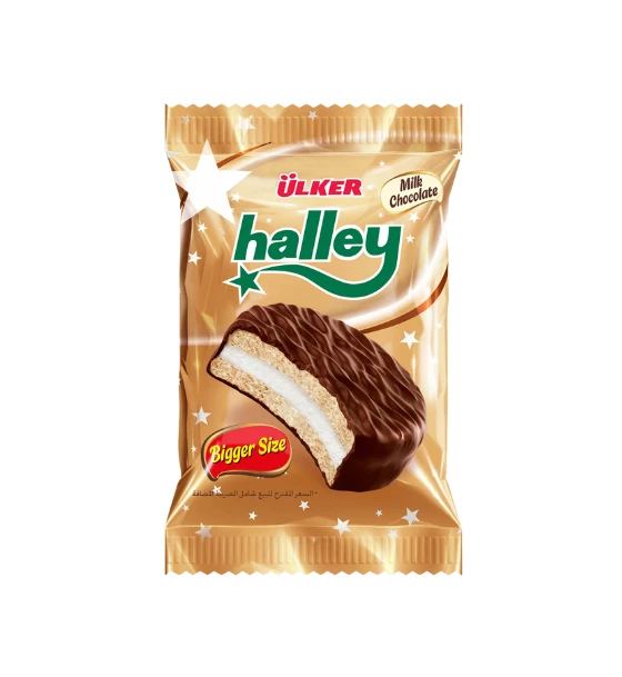Ülker Halley هو بسكويت ناعم محشو بالمارشميلو ومغطى بالشوكولاتة. يقدم طعماً حلواً متوازناً وملمساً ناعماً، مما يجعله مثالياً للوجبات الخفيفة ووقت الشاي والاستمتاع اليومي في المنزل أو أثناء التنقل.