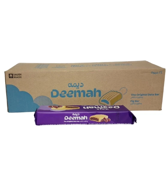 صورة لبسكويت ديمة بالتمر (Deemah Date Bars) بوزن 75 غرام بجانب كرتون عرض الجملة الذي يحتوي على 24 عبوة، تظهر التغليف الأرجواني والذهبي المميز.