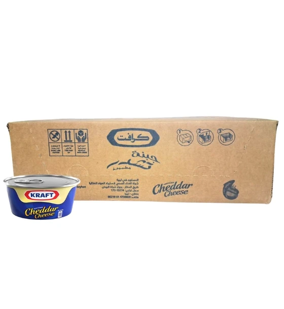 صورة لعلبة جبنة شيدر كرافت الأصلية بحجم 190 غرام بجانب الكرتون الخاص بها، تظهر تفاصيل العلامة التجارية والتغليف المخصص للتوزيع.